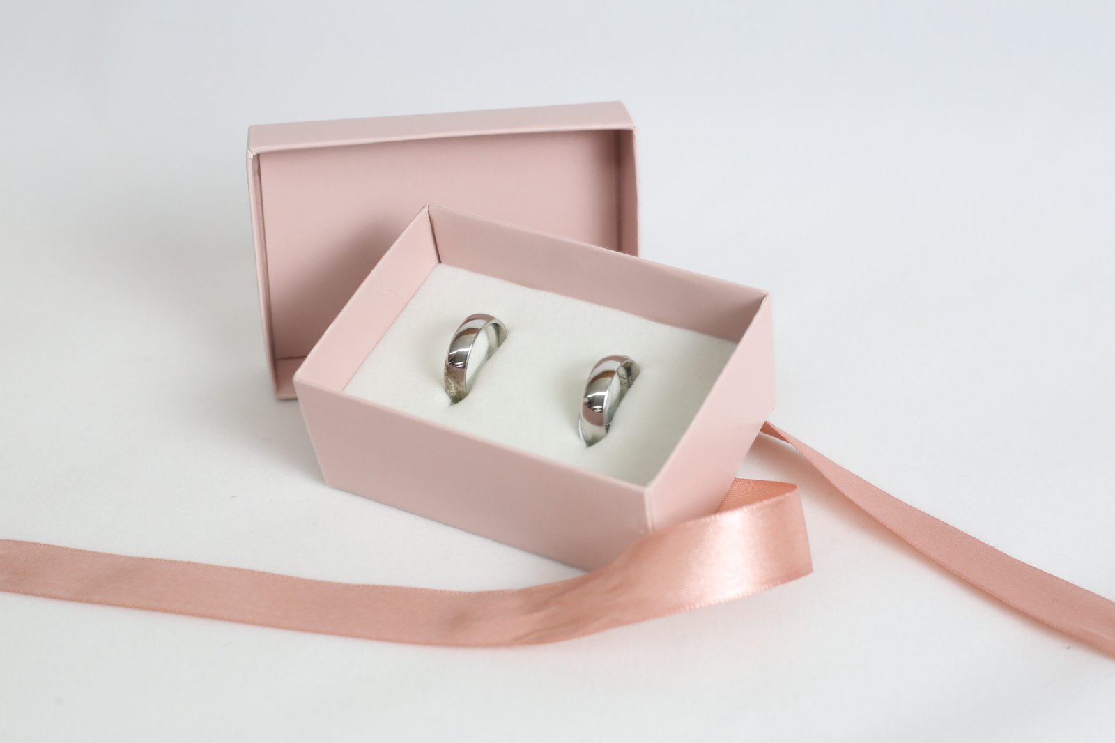 Estojo para aliança cartonado com revestimento interno em veludo e fechamento com fita de cetim