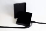 Estojo de colar, brinco e anel com revestimento externo em adesivo de vinil, acabamento interno em espuma laminada em veludo e fechamento com fita de cetim.