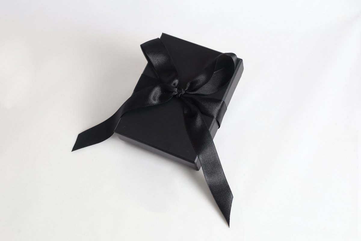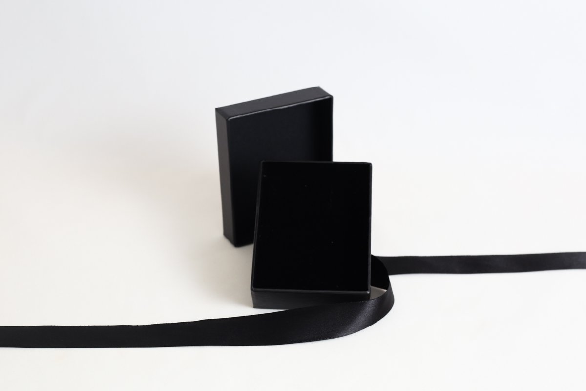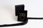 Estojo para brinco e gargantilha com revestimento externo em adesivo de vinil, acabamento interno em espuma laminada em veludo e fechamento com fita de cetim.