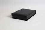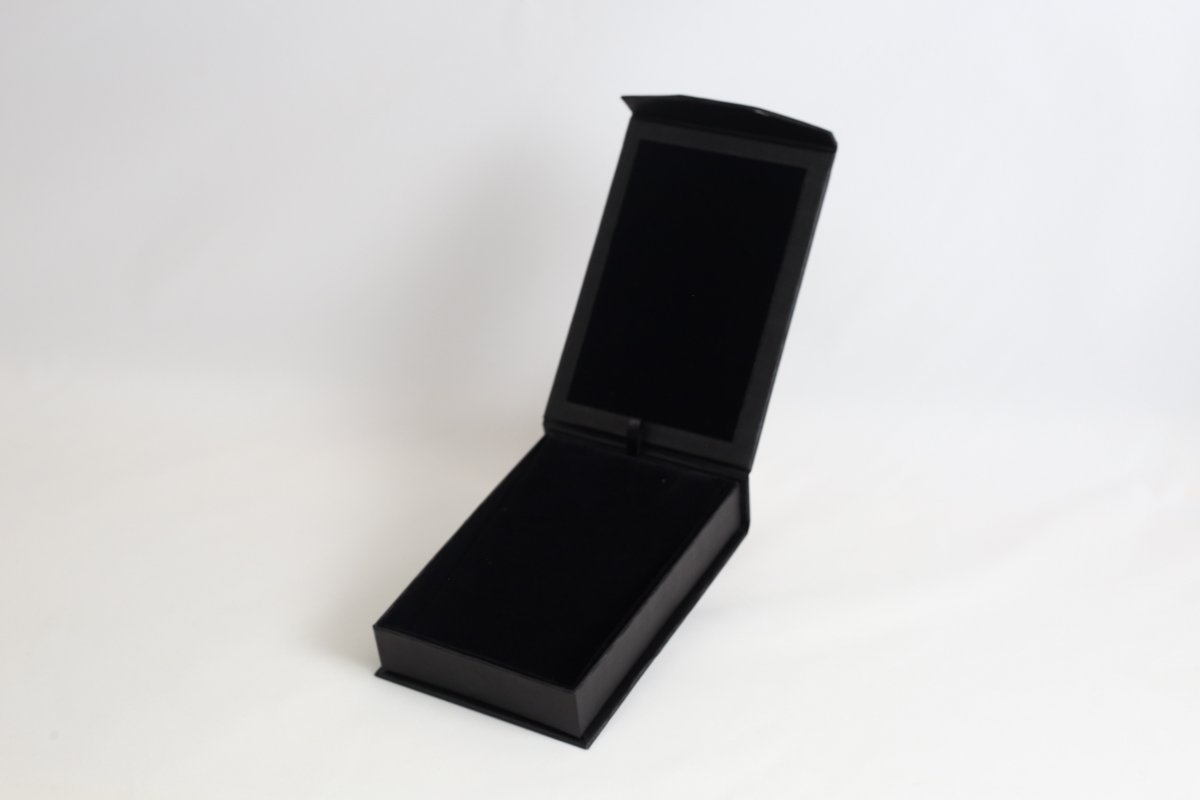 Revestimento externo em papel telado e interno em veludo.