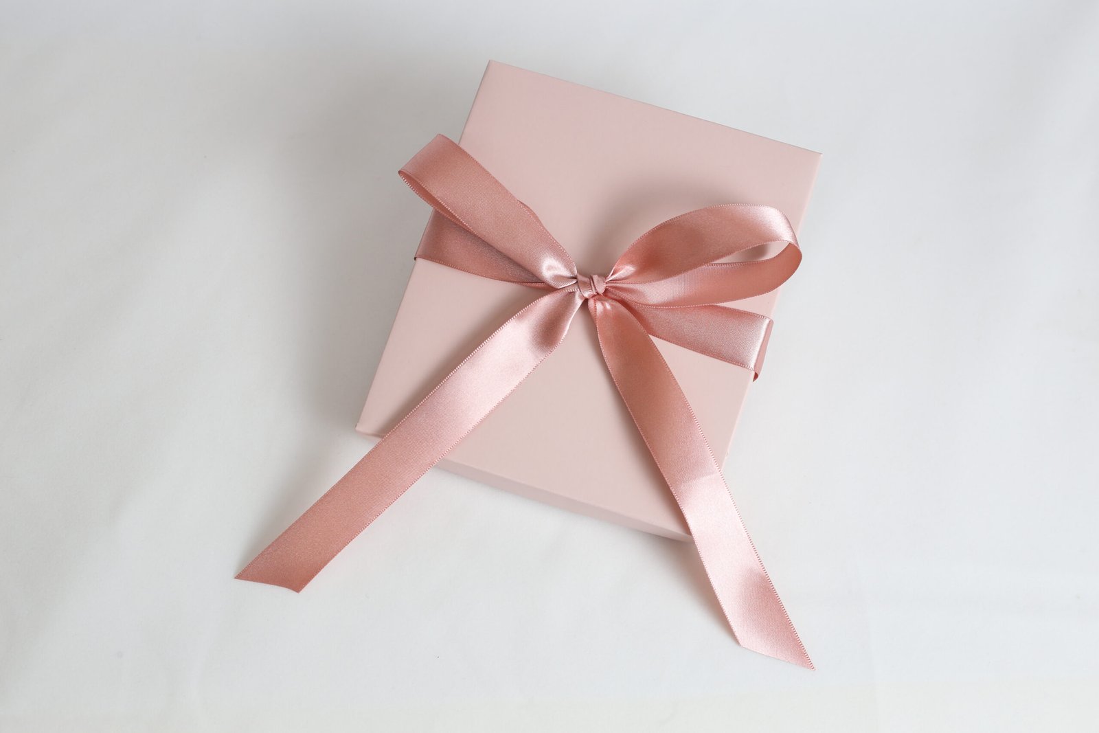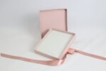 Estojo colar, brinco e anel cartonado com revestimento interno em veludo e fechamento com fita de cetim.