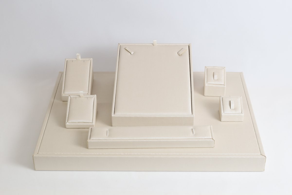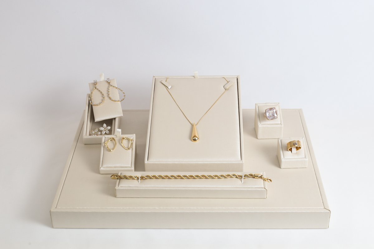 Vitrine completa: 1 Busto (com depósito), 1 pulseira estendida, 2 expositores de brinco (com depósito) e 2 expositores presilha para anel.
